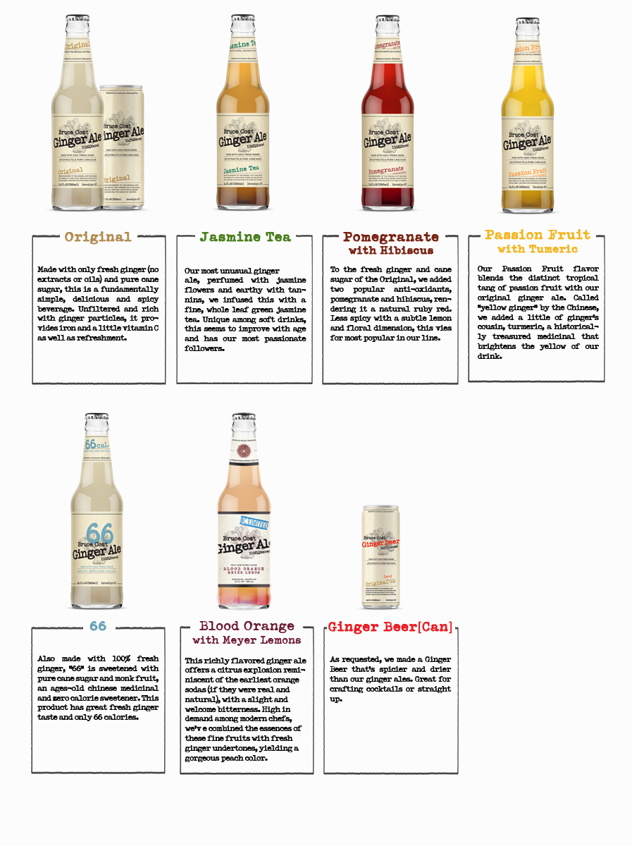 Proud descendant of the first soft drink, Bruce Cost Ginger Ale is delicious, sparking and rich with whole ginger (long enjoyed for digestive comfort.) Unique among ginger ales, it's made with only fresh ginger
